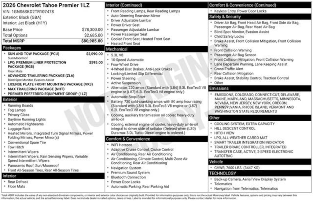 Schumacher Chevrolet of Boonton is pumped up to offer this great-looking 2026 Chevrolet Tahoe Premier in Black Beautifully equipped with Advanced Trailering Package (Blind Zone Steering Assist w/Trailering, Hitch View w/Pan/Zoom Image Adjustment, and Smart Trailer Integration Indicator), License Plate Front Mounting Package, Max Trailering Package (2-Speed Active Electronic AutoTrac Transfer Case, Hill Descent Control, and Integrated Trailer Brake Controller), Preferred Equipment Group 1LZ (1st & 2nd Row Color-Keyed Carpeted Floor Mats, 3-Spoke Wrapped Steering Wheel, 3rd Row 60/40 Power-Folding Split-Bench Seat, Auto-Dimming Inside Rear-View Mirror, Bose 10-Speaker Centerpoint Surround Audio Sys Ft, Bright Front & Rear Door Sill Plates, Chrome Door Handles w/Body-Color Strip, Chrome Mirror Caps, Color-Keyed Carpeting Floor Covering, Dual Exhaust System, Floor Console, Front LED Fog Lamps, Frontal Driver & Outboard Passenger Airbags, Heated 2nd Row Outboard Seats, Heated Steering Wheel, Interior Camera, Key Card, LED Headlamps w/LED Daytime Running Lamps, LED Tail Lamps, Memory Settings, Outside Heated Power-Adjustable Mirrors, Power Release 2nd Row Bucket Seats, Power Tilt & Telescopic Steering Column, Rear Power Liftgate, Remote Start, SiriusXM w/360L Trial Subscription, Universal Home Remote, and Wireless Phone Charging), Premium Liner Protection Package (LPO) (1st & 2nd Rows Premium Floor Liners (LPO), 3rd Row All-Weather Floor Liners (LPO), and All-Weather Cargo Mat (LPO)), Sun & Tow Package (Dual-Pane Power Panoramic Sunroof), 4WD, Black Leather, 10 Speakers, 20 x 9 Polished Aluminum Wheels, 3.23 Rear Axle Ratio, 3rd row seats: split-bench, 4-Way Power Driver Lumbar Seat Adjuster, 4-Way Power Front Passenger Lumbar Seat Adjuster, 4-Wheel Disc Brakes, 8-Way Power Driver Seat Adjuster, 8-Way Power Front Passenger Seat Adjuster, ABS brakes, Adaptive suspension, Air Conditioning, Alloy wheels, AM/FM radio: SiriusXM with 360L, Apple CarPlay/Android Auto, Auto High-beam Headlights, Auto-dimming door mirrors, Auto-dimming Rear-View mirror, Auto-leveling suspension, Automatic temperature control, Brake assist, Bumpers: body-color, Compass, Delay-off headlights, Driver & Front Passenger Heated & Ventilated Seats, Driver door bin, Driver vanity mirror, Dual front impact airbags, Dual front side impact airbags, Electronic Stability Control, Emergency communication system: OnStar and Chevrolet connected services capable, Exterior Parking Camera Rear, Extra Capacity Cooling System, Four wheel independent suspension, Front anti-roll bar, Front Bucket Seats, Front Center Armrest, Front dual zone A/C, Front fog lights, Front reading lights, Fully automatic headlights, Garage door transmitter, Heated door mirrors, Heated Driver & Front Passenger Seats, Heated front seats, Heated rear seats, Heated steering wheel, Illuminated entry, Low tire pressure warning, Magnetic Ride Control Suspension, Memory seat, Navigation system: Google built-in compatibility (select service plan required, terms and limitations apply), Occupant sensing airbag, Outside temperature display, Overhead airbag, Overhead console, Panic alarm, Passenger door bin, Passenger vanity mirror, Perforated Leather Seat Trim, Power door mirrors, Power driver seat, Power Liftgate, Power passenger seat, Power steering, Power windows, Premium audio system: Chevrolet Infotainment 3 Premium, Radio data system, Radio: 17.7 Diagonal Advanced Color LCD Display, Rain sensing wipers, Rear air conditioning, Rear anti-roll bar, Rear reading lights, Rear window defroster, Rear window wiper, Remote keyless entry, Security system, Speed control, Speed-sensing steering, Split folding rear seat, Spoiler, Steering wheel memory, Steering wheel mounted audio controls, Tachometer, Telescoping steering wheel, Tilt steering wheel, Traction control, Trip computer, Turn signal indicator mirrors, Variably intermittent wipers, Ventilated front seats, and