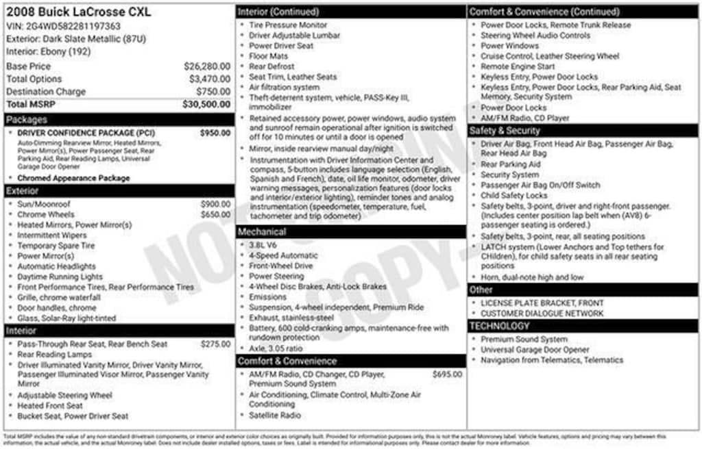 Dark Slate Metallic 2008 Buick LaCrosse CXL 4D Sedan FWD 4-Speed Automatic with Overdrive 3.8L V6 SFI 17/28 City/Highway MPG