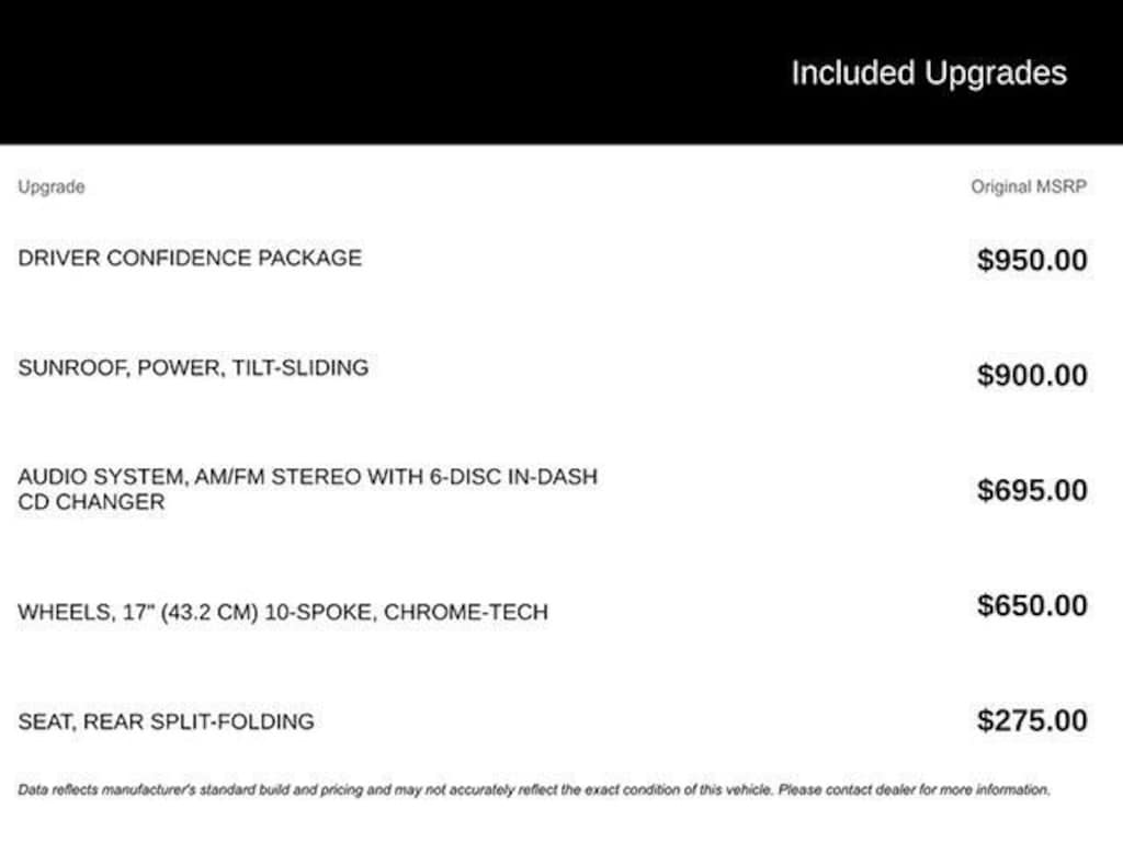 Price(s) include all costs to be paid by consumer, except for licensing costs, registration fees and taxes. Dealer is not responsible for typographical or pricing errors. Additional $399 doc fee due at time of sale. Although every reasonable effort has been made to ensure the accuracy of the information contained on this site, absolute accuracy cannot be guaranteed. This site, and all information and materials appearing on it, are presented to the user "as is" without warranty of any kind, either express or implied, including but not limited to the implied warranties of merchantability, fitness for a particular purpose, title or non-infringement. All vehicles are subject to prior sale. MPG estimates on this website are EPA estimates; your actual mileage may vary. For used vehicles, MPG estimates are EPA estimates for the vehicle when it was new. The EPA periodically modifies its MPG calculation methodology; all MPG estimates are based on the methodology in effect when the vehicles were new (please see the "Fuel Economy" portion of the EPA's website for details, including a MPG recalculation tool). Not available with special finance, lease and some other offers. Prices do not include additional fees and costs of closing, including government fees and taxes, any finance charges, any dealer documentation fees, any emissions testing fees or other fees. All prices, specifications and availability subject to change without notice.