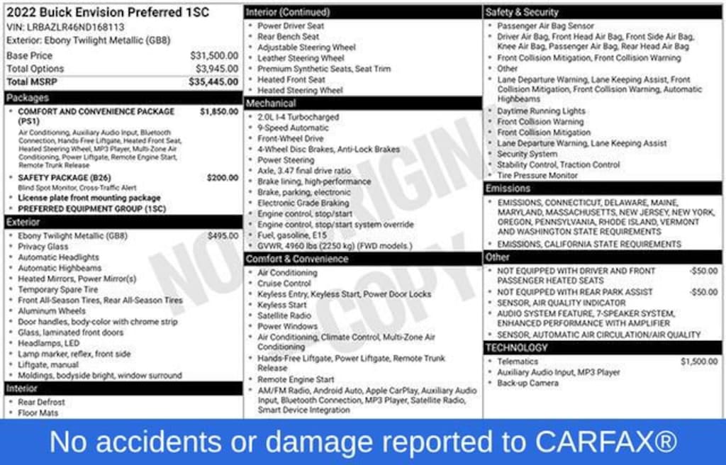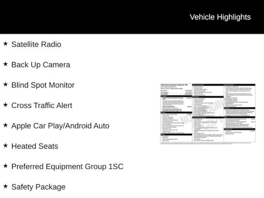Odometer is 7511 miles below market average!Satellite Radio, Back Up Camera, Blind Spot Monitor, Cross Traffic Alert, Apple Car Play/Android Auto, Heated Seats, 7-Speaker Audio System Feature w/Amplifier, Air Quality Indicator Sensor, Automatic Air Circulation/Air Quality Sensor, Comfort & Convenience Package, Dual-Zone ACC Air Conditioning, Hands Free Power Programmable Liftgate, Heated Driver & Front Passenger Seats, Heated Steering Wheel, Lane Change Alert w/Side Blind Zone Alert, Preferred Equipment Group 1SC, Radio: Buick Infotainment System AM/FM Stereo, Rear Cross Traffic Alert, Remote Vehicle Starter System, Safety Package.Ebony Twilight Metallic 2022 Buick Envision Preferred 4D Sport Utility FWD 9-Speed Automatic 2.0L Turbocharged 24/31 City/Highway MPG