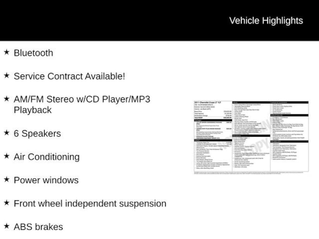 Discover the perfect blend of style, efficiency, and technology with this 2011 Chevrolet Cruze 1LT. This well-maintained sedan offers a compelling combination of features that cater to the modern driver's needs.- Bluetooth connectivity- Available service contract- Cruise control- Rear parking assist- Remote vehicle starter system- 6 speakers- Air conditioning- Power windows- Cruise control- Brake assist- Fully automatic headlights- Telescoping steering wheel- Tilt steering wheel- ABS brakes- Front wheel independent suspension- Security system- 16 5-Spoke Machined-Face Alloy WheelsUnder the hood, the ECOTEC 1.4L I4 DOHC VVT Turbocharged engine delivers a responsive and efficient driving experience, with an impressive EPA-estimated 24 city/36 highway MPG. The 6-speed automatic transmission with overdrive seamlessly transfers power to the front wheels, ensuring a smooth and confident ride.Slip behind the wheel and you'll be greeted by a well-appointed interior that caters to your comfort and convenience. The driver's 6-way power seat adjuster with manual recliner allows you to find your perfect driving position, while the leather-wrapped steering wheel and shift knob add a touch of refinement.Safety is also a top priority, with features like dual front and side impact airbags, an anti-roll bar, and a security system providing you and your passengers with peace of mind. The Rear Parking Assist makes maneuvering in tight spaces a breeze, and the compact spare tire and jack ensure you're prepared for the unexpected.Whether you're commuting to the office or embarking on a weekend getaway, this 2011 Chevrolet Cruze 1LT is the perfect companion. Experience the perfect balance of style, efficiency, and technology visit our showroom today and let us put you behind the wheel of this exceptional sedan.