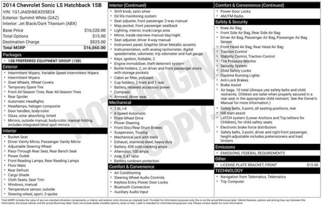 Summit White 2014 Chevrolet Sonic LS 4D Hatchback FWD 6-Speed Automatic ECOTEC 1.8L I4 DOHC VVT 25/35 City/Highway MPG