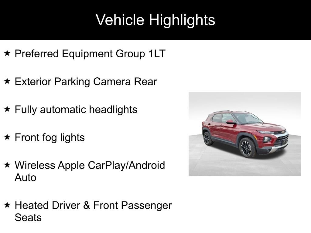 TrailBlazer LT, 1.2L Ecotec Turbo DOHC DI w/VVT, CVT, FWD, Crimson Metallic, Black Cloth, Exterior Parking Camera Rear, Front fog lights, Fully automatic headlights, Heated Driver & Front Passenger Seats, Preferred Equipment Group 1LT, Wireless Apple CarPlay/Android Auto.