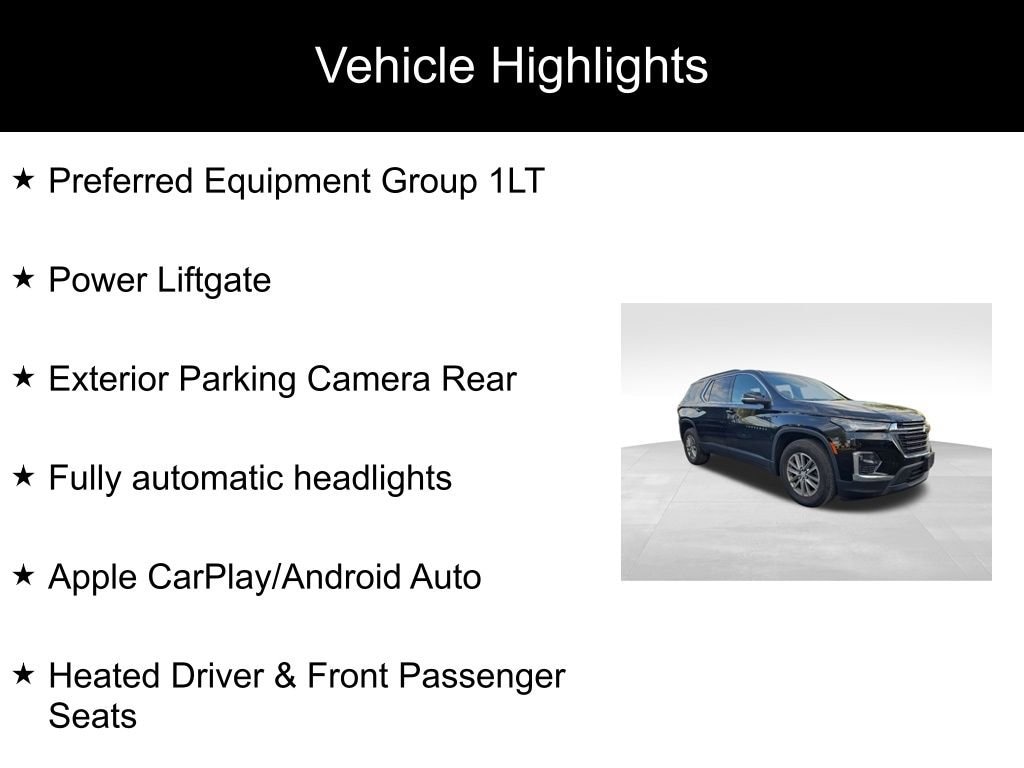 Traverse LT 1LT, 4D Sport Utility, 3.6L V6 SIDI VVT, 9-Speed Automatic, AWD, Mosaic Black Metallic, Jet Black Cloth, Apple CarPlay/Android Auto, Exterior Parking Camera Rear, Fully automatic headlights, Heated Driver & Front Passenger Seats, Power Liftgate, Preferred Equipment Group 1LT.
