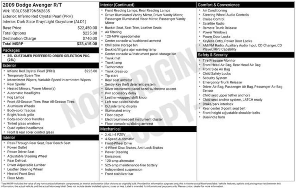 Inferno Red Crystal PC/Mineral Gray Met CC 2009 Dodge Avenger SXT 4D Sedan FWD 4-Speed Automatic VLP 2.4L 4-Cylinder DOHC 16V Dual VVT 21/30 City/Highway MPG