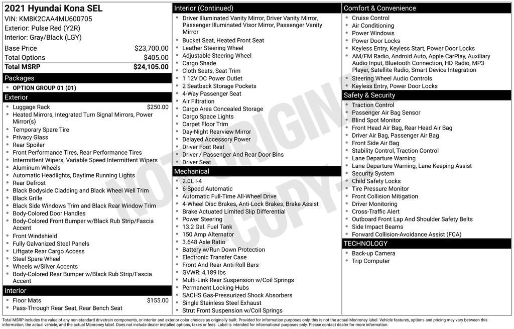 Odometer is 8599 miles below market average!Pulse Red 2021 Hyundai Kona SEL 4D Sport Utility AWD 6-Speed Automatic I4 25/30 City/Highway MPGFinal price includes all Factory Incentives.