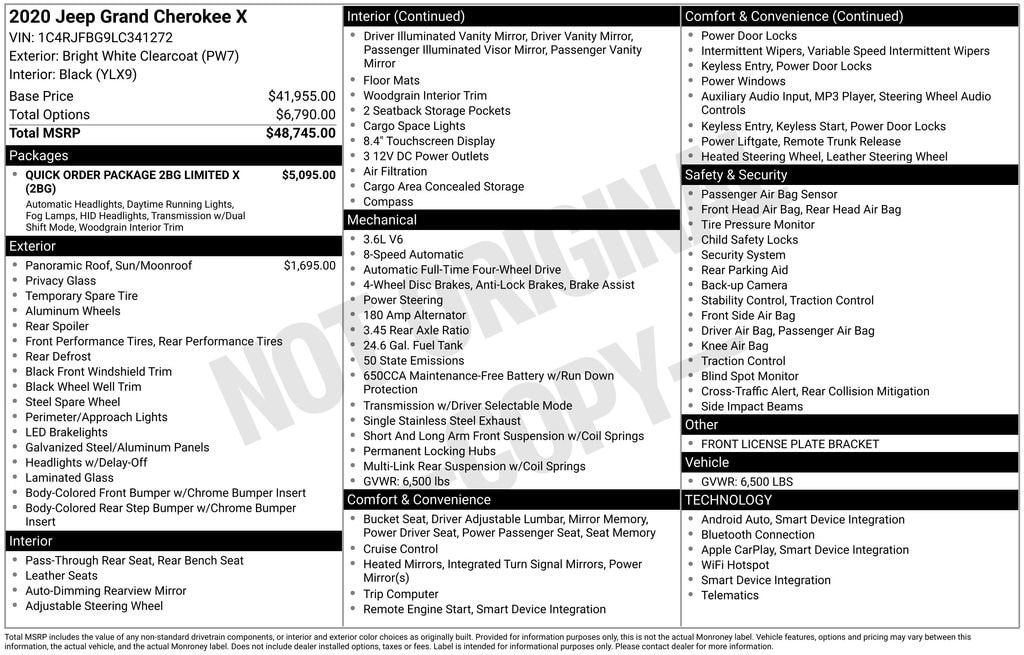 4WD.Bright White Clearcoat 2020 Jeep Grand Cherokee Limited X 4D Sport Utility 4WD 8-Speed Automatic 3.6L V6 24V VVTFinal price includes all Factory Incentives.